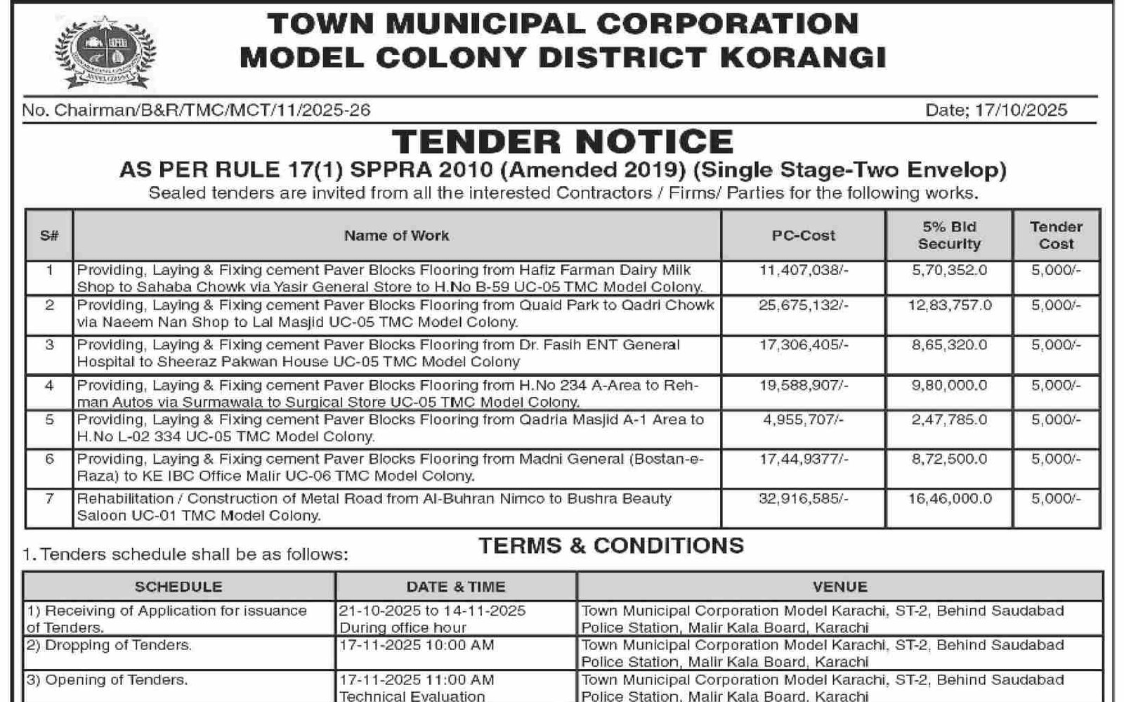 The Town Municipal Corporation (TMC) Model Colony, District Korangi, Karachi, has officially issued a comprehensive Tender Notice under Rule 17(1) of the Sindh Public Procurement Regulatory Authority (SPPRA) Rules 2010 (Amended 2019). Dated 17th October 2025, this tender outlines a series of infrastructure development and rehabilitation projects aimed at improving public facilities, road flooring, and municipal structures across Model Colony.